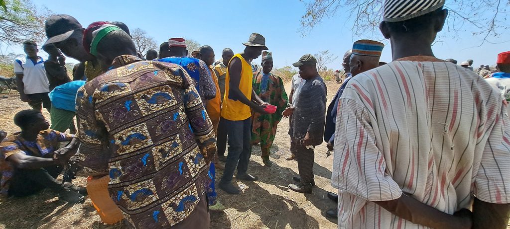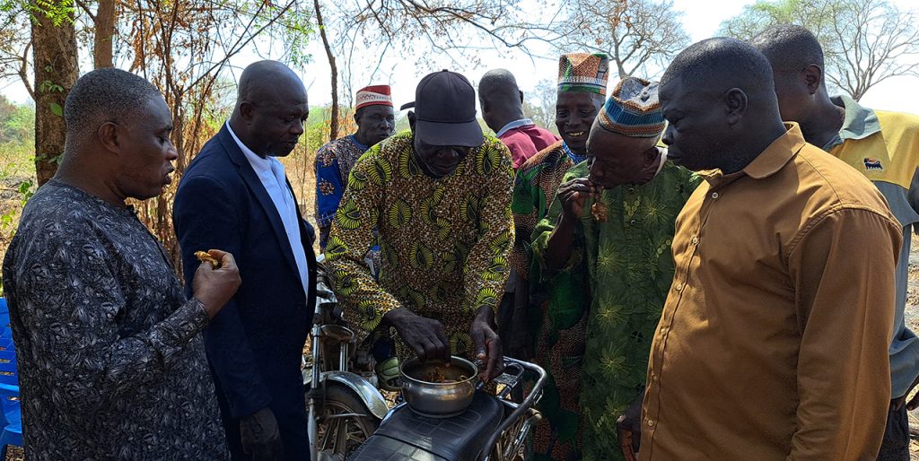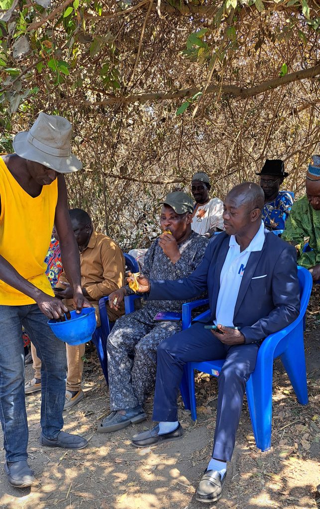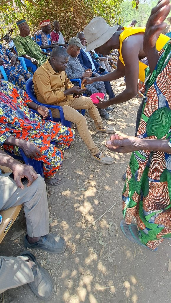 Elle est présidée par le chef du village Adjibarou sur la rive droite du fleuve Ogou et deux sages du village d’Awayo sur la rive gauche en présence des chefs de villages et leurs bureaux de comité villageoise de développement, les chefs de quartiers, le chef de canton, le président du comité cantonale de développement de Gbadjahè, de l’honorable député à l’Assemblée Nationale, du Maire de la commune Est-Mono 1, les autorités locales et traditionnelles et la vaillante population du canton de Gbadjahè sortie massivement pour exprimer leur joie à la cérémonie de libation qui marque les préliminaires des travaux préparatoires de construction du pont sur le fleuve Ogou. Ils ont immolé deux poules, une chèvre de couleur noire, un bélier de couleur blanc et versé des liqueurs et du boisson local tchoukoutou par terre à la suite des prières dites à haute voix devant les populations. Diverses sollicitations relatives au vivre ensemble et à la bonne collaboration entre les agents de l’entreprise Matière et la population bénéficiaire du joyau et à la réussite des travaux de construction du pont dans le délai imparti.